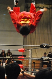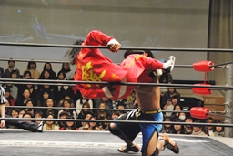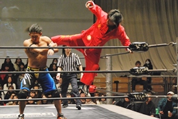 彰人コーナーに振って突っ込む、MIKAMIジャンピングハイキック(右写真)、