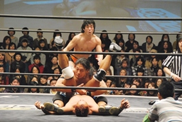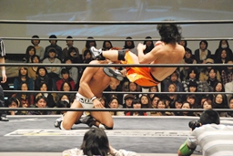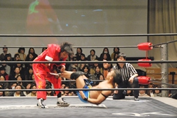 佐藤ロープに飛ぶ、坂口カウンターのドロップキック(右写真)。松野がリングイン。