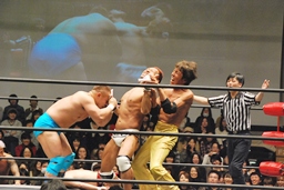 松永とマイケルが高梨相手に連携攻撃(右写真)。