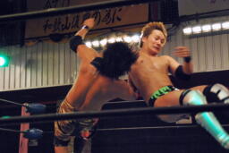 SUSUMUもジャーマン連発(左写真)、ダブルノックダウン。