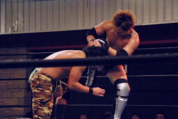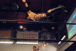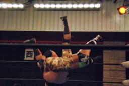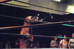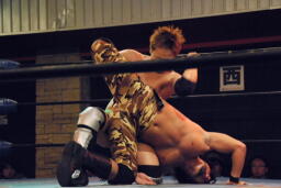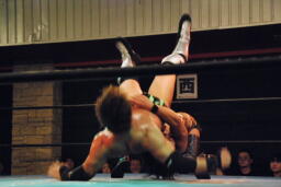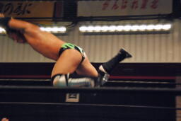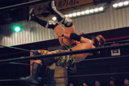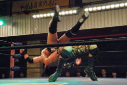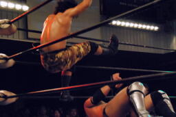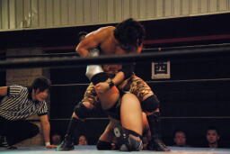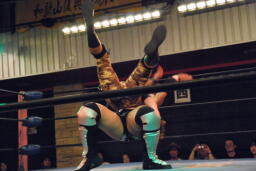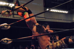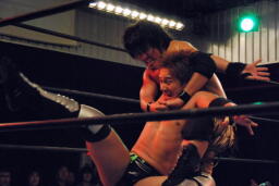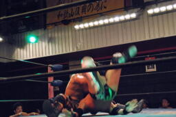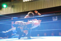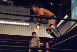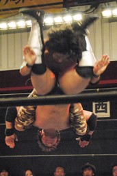 セカンドコーナーに上ってギロチンドロップ(左写真)、カウント2。ボディスラムからカバー、カウント2。5分経過。