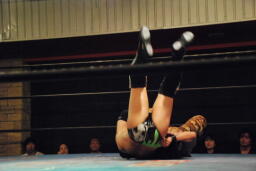 SUSUMUが開始と同時に突進、フライングネックブリーカードロップ(右写真)、ブレーンバスター。内田場外エスケープ。