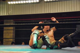SUSUMU顔面にヒザ蹴り、変形の逆片エビ固め(左写真)、内田ロープ。