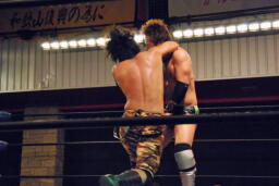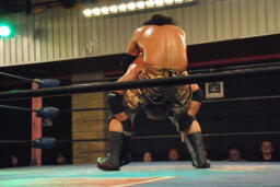 SUSUMUボディスラム、コーナーに上る、内田捕まえて雪崩式のスタナーに(右写真)。