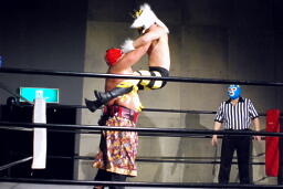 カミナリモンスターはチョークスラム(左写真)、カウント2。