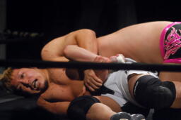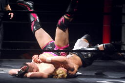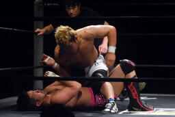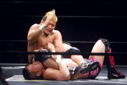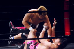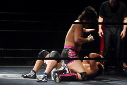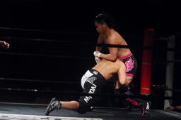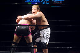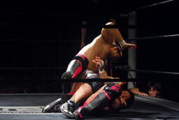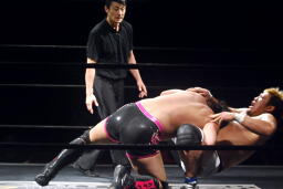 間下ブロックして上になる(左写真)、両者ロープ際でもつれあってレフェリーがブレーク。