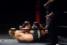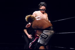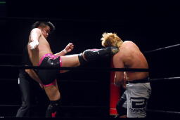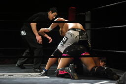ボディにパンチ(右写真)と打ち分ける。竹田アンクルホールド、間下ロープ。間下ロストポイント2、あと1つでTKO負け。