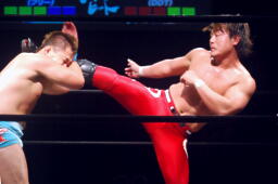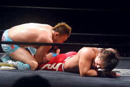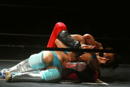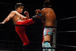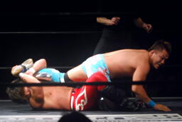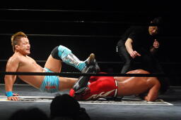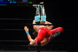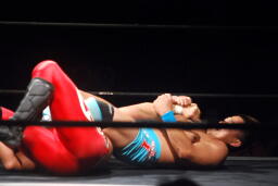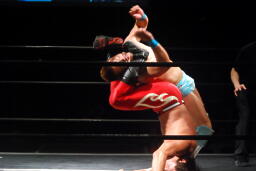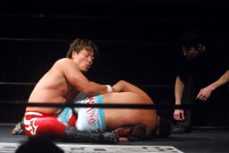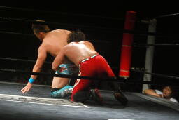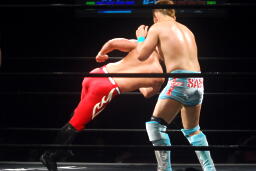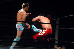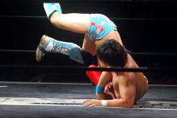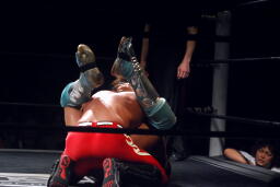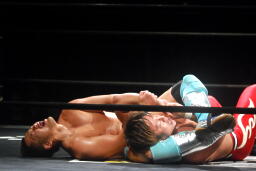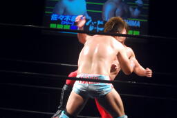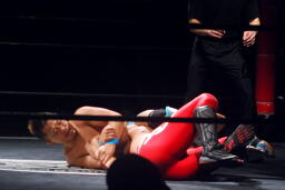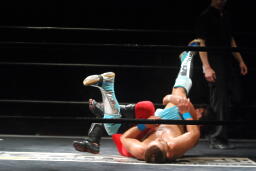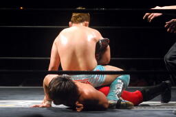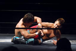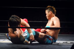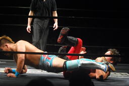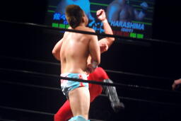 恭介アームロック(右写真)、HARASHIMA切り返す。恭介アンクルホールド、HARASHIMAロープ。HARASHIMAロストポイント1。