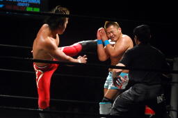 ハイキック(左写真)、恭介ダウン。カウント9。恭介ロストポイント3。