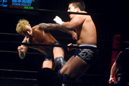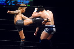 掌底(左写真)、橋本ダウン。カウント9。橋本ロストポイント3。