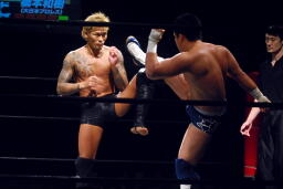 ローキック(右写真)、橋本ダウン。カウント9。ロストポイント4、あと1つでTKO負け。