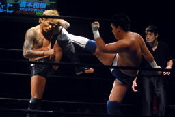 坂口ヒザ蹴りからハイキック、橋本ダウン(右写真)。カウント6。橋本ロストポイント2。