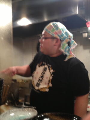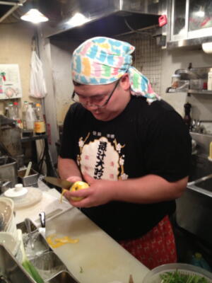 本日は10/20に行われたフードファイト「Foodist Stage」(詳しくはこちら)に見事勝利した伊橋剛太の勝利メニュー披露&祝勝会@エビスコ酒場。午前0時開始の予定が、通常営業が忙しくイベントには移れない様子(右写真)。