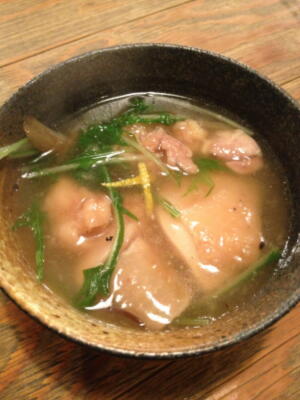 1時30分、1品目・剛太の鍋が出る(右写真)。鶏肉の下ごしらえに使った片栗粉がいい感じのとろみを出している。