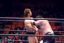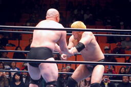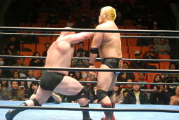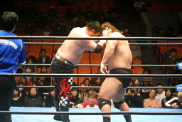 先発は火野と岡林。ロックアップ、岡林ロープに押し込む、火野体勢入れ替える、ブレーク。火野タックル、岡林かわして腕を取る(左写真)、火野切り返す。