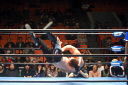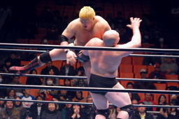 稲松フルネルソン、岡林はコーナーに下がってブレーク。稲松エルボー、ロープに飛ぶ、岡林パワースラム(右写真)、カウント2。