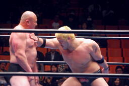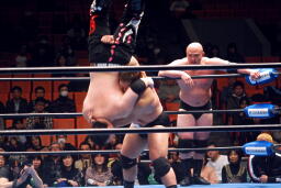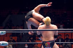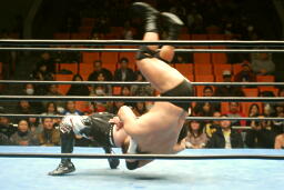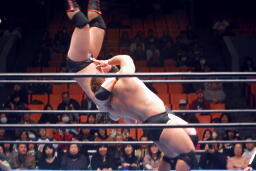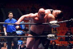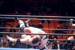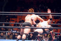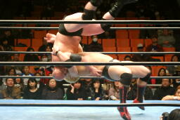 関本と岡林はクイックタッチでボディスラムを交互に連発(右写真)。岡林が連続カバー、稲松カウント2で返す。関本にタッチ。5分経過。
