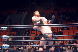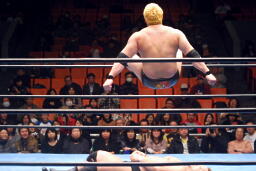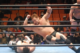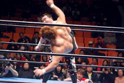 関本ボディスラムからコーナーに上ってフロッグスプラッシュ(左写真)、カウント2。