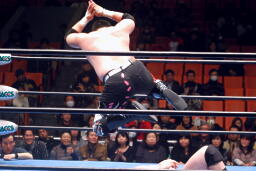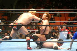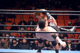 岡林コーナーに詰めて逆水平連発、ストンピング、首投げからカバー、カウント2。関本にタッチ。関本ブレーンバスター(右写真)、カウント2。