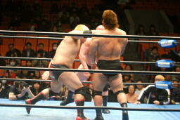 火野フライングショルダーブロック(左写真)、ボディスラム。両軍タッチ。