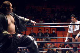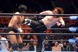 GENTARO逆水平、真霜エルボー(右写真)、GENTARO張り手。