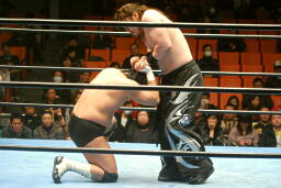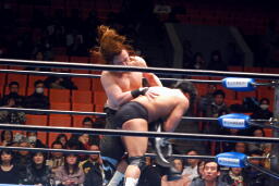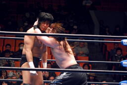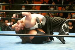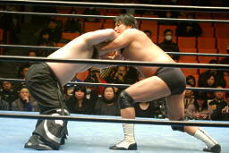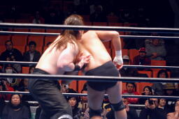 ロックアップ(右写真)、真霜が押す、GENTARO押し返す。真霜がロープに押し込む、ブレーク。