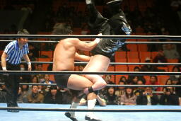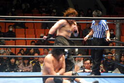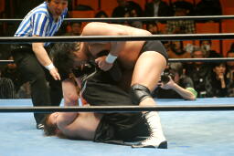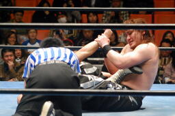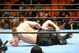 再度スリーパーに(左写真)。締め上げてカバー、カウント2。20分経過。