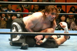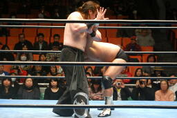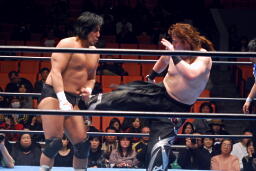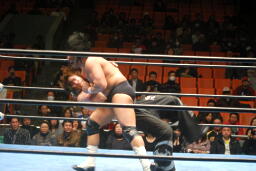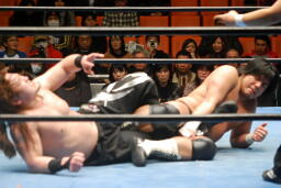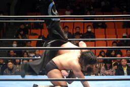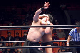 GENTARO真霜の足を取って場外に投げる(右写真)。
