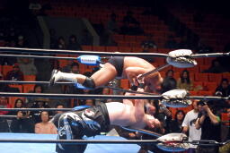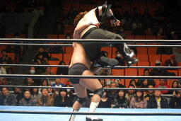 真霜ガットショット、ヘッドロック、GENTAROロープに振ってロープワークから真霜ショルダーブロック、互いにフライングメイヤー(左写真)、ヘッドシザーズでブレーク。