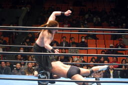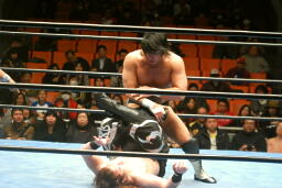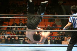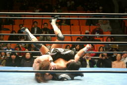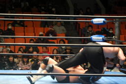 足4の字(左写真)。真霜ひっくり返す、GENTAROさらにひっくり返す。真霜がロープ。