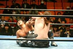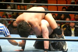 ロックアップ、真霜ハンマーロック(右写真)、GENTARO切り返す。マシもヘッドロックに。腕をひねる。