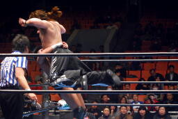 GENTAROが先に垂直落下式ブレーンバスター(左写真)、ダブルノックダウン。