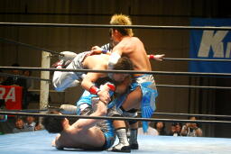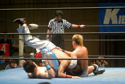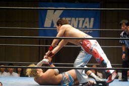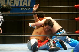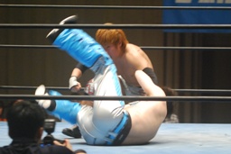 佐藤が回転して脱出しようとするが旭は自ら回転してそれを阻止(左写真)。佐藤飛びついてフライングメイヤー、浅井ヘッドシザーズでブレーク。足のすくい合い、ブレーク。両軍タッチ。