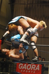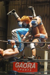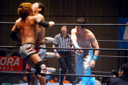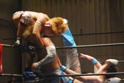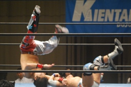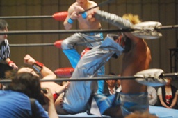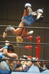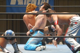 飛びついてのアームホイップ(左写真)。旭が入ってダブルでロープに振る、トウナイ切り返して2人を同士討ちさせる。大石場外転落。トウナイロープに飛ぶ、大石リング下から足を引っ張る。