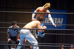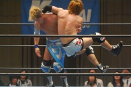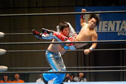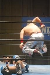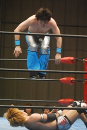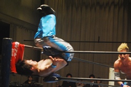 佐藤が大石をボディスラム、コーナーに上る、旭がジャンピングハイキック(右写真)。
