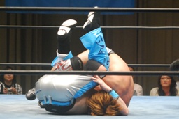 旭バックエルボー、卍固めに行くが佐藤はかわしてスクールボーイ、カウント2。首固め(右写真)、これもカウント2。さらにエビ固め連発、いずれもカウント2。