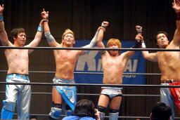 大石がトウナイにスタナー、大石佐藤にエルボー、佐藤大石にラリアット、佐藤とトウナイが大石にギャラクシー☆フォール(左写真)、カウント2。4人ともダウン。10分経過。