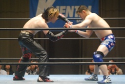 イサミタックル(左写真)、腕をひねる。TAKA切り返してヘッドロックからフライングメイヤー、イサミヘッドシザーズでブレーク。