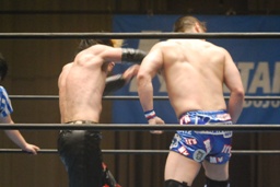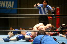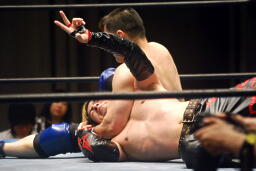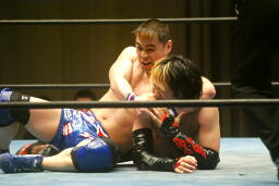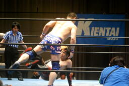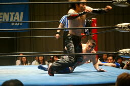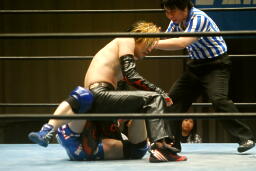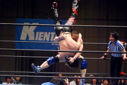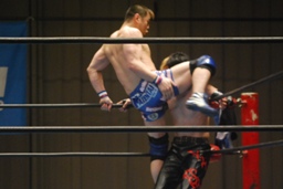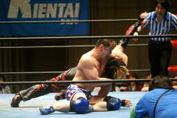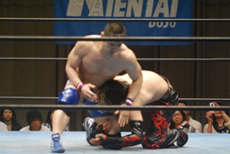 イサミサソリ固め狙うがTAKAはブロックしてロープ。イサミ突っ込む、TAKAカニばさみ(右写真)で倒し後頭部にヒザ蹴り。