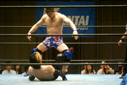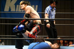イサミ寝っ転がり、TAKAの両足を下から浮かして(右写真)倒す。イサミ足を取りに行くがTAKAはブレーク。