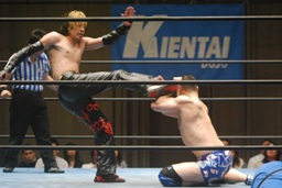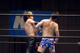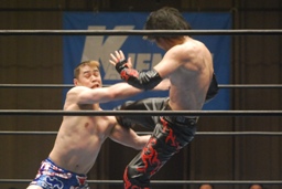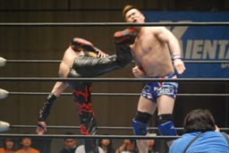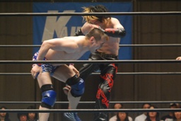 TAKA串刺しのヒザ蹴り、イサミ両腕でブロック(右写真)。