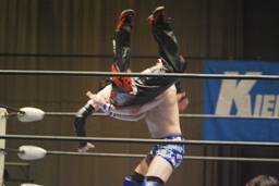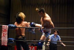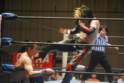 TAKAコーナーに振って串刺しのヒザ蹴り、イサミかわして低空ドロップキック(右写真)。
