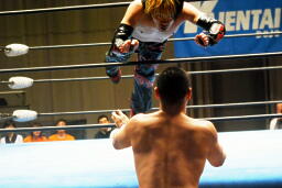 TAKAみちのくドライバーU狙う、イサミ着地して顔面パンチ(右写真)。