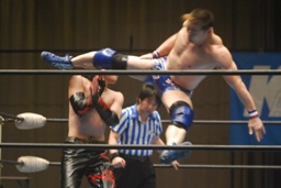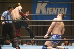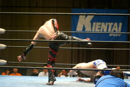 TAKAをリングに戻し自分はコーナーに上るとダイビングボディアタック(左写真)。