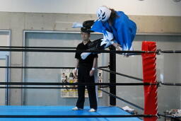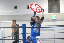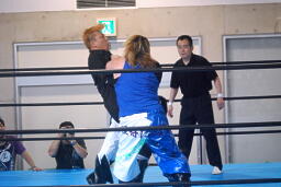 場外で魁の攻撃を受けるたびに女性客に抱きつきに行くKAZE(右写真)。