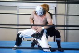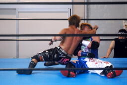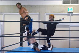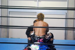 KAZEエルボー(右写真)、魁ガットショット、踏みつけてカバー、カウントは1。魁チョーク攻撃、504にタッチ。