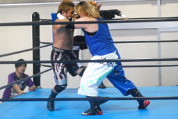 KAZEガットショット連打、コーナーに詰めてヒザで圧迫(右写真)。