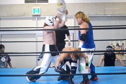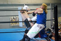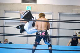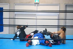 504足をすくってトーホールド(右写真)、ダブルレッグロックからヘッドロック、フライングメイヤー、KAZEはヘッドシザーズでブレーク。両軍タッチ。