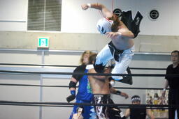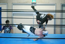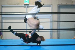 504ダブルリストアームサルト(左写真)、カウント2。魁にタッチ。10分経過。