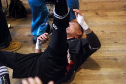 先発はKAZEと504。バックの取り合い(左写真)、KAZE腕をひねる。